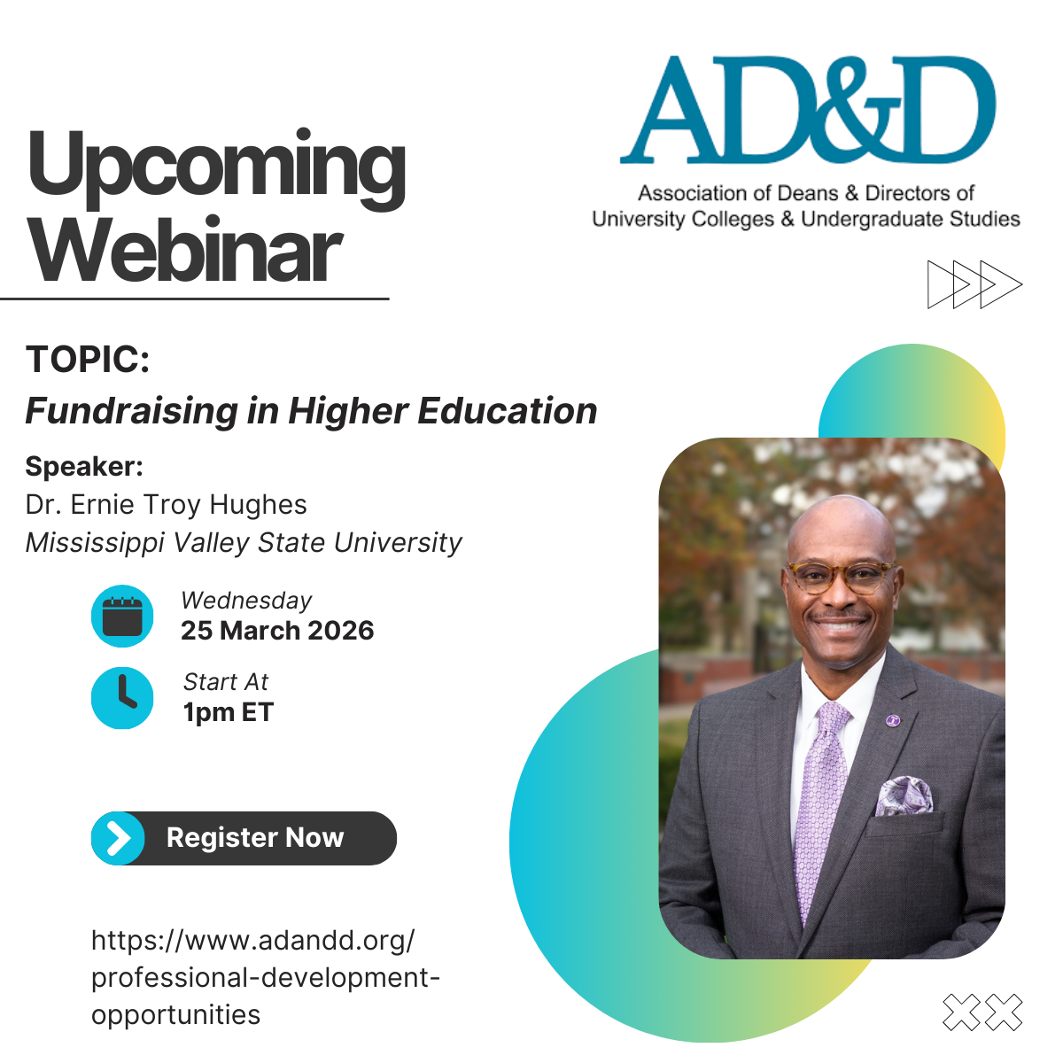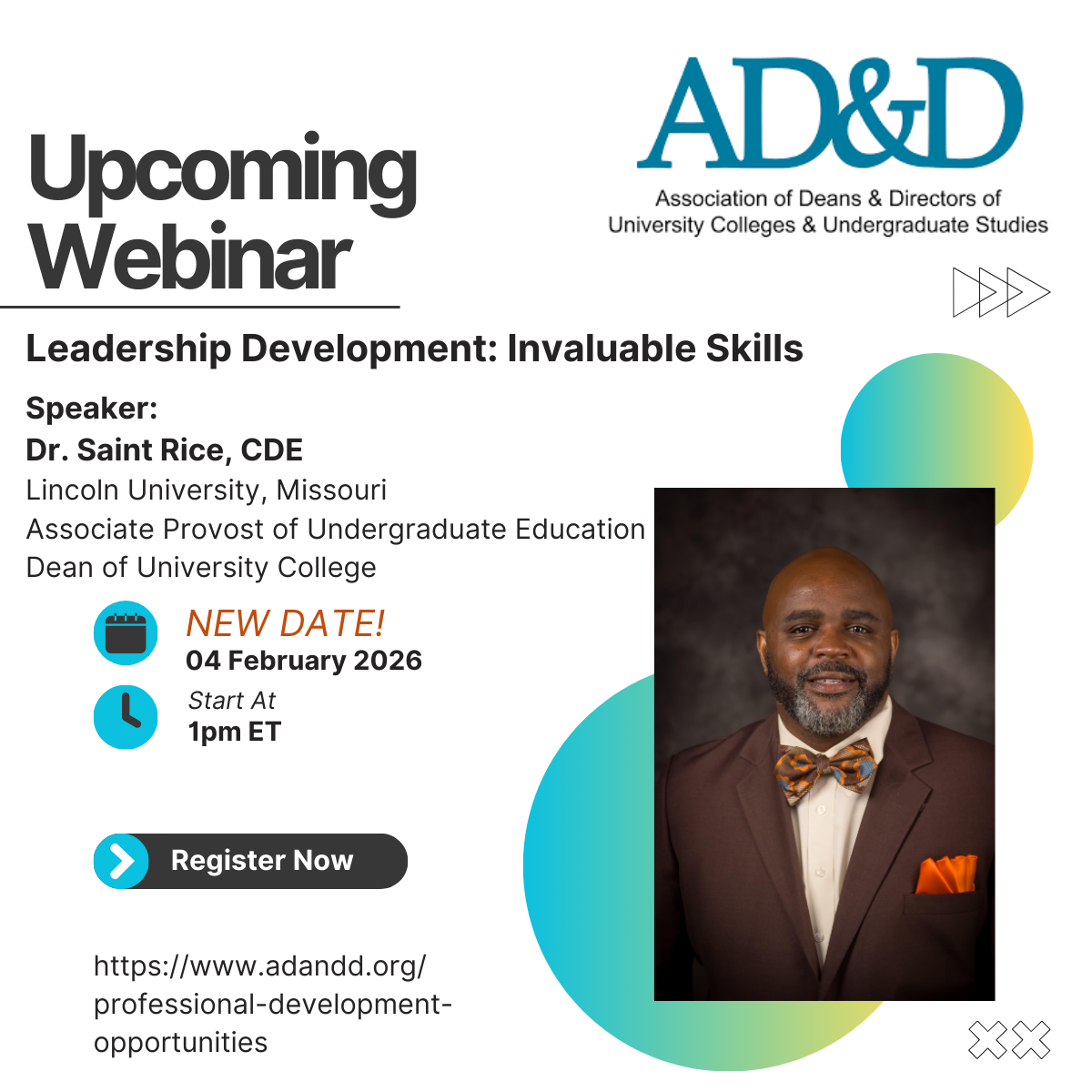 AD&D Professional Development OpportunitiesThe Association of Deans and Directors of University Colleges and Undergraduate Studies aims to provide professional development opportunities for its members across the country. If you are interested in presenting on a particular topic, feel free to email our office at [email protected] with your presentation proposal. Check out our upcoming virtual meetings and webinars! UPCOMING AD&D WEBINARS - Mark Your Calendars! Be Sure to Register Today! Date/Time: NEW DATE: February 4, 2026, 1pm ET (Duration: 1 hour) WEBINAR: Leadership Development: Invaluable Skills Session Description: Speaker: Biography: Dr. Saint Rice, Jr. is a visionary higher education leader, scholar, and executive strategist with over 25 years of experience in organizational transformation, academic innovation, and community empowerment. He currently serves as Associate Provost for Undergraduate Education and Dean of University College at Lincoln University of Missouri, where he leads undergraduate education, student success initiatives, and faculty development to advance retention, academic integrity, and holistic student growth.